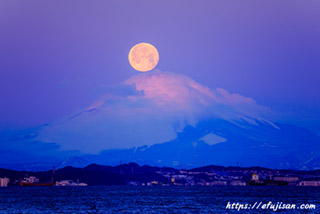 | 4月29日 18時46分 静岡県朝霧高原 NIKON D810 80-400mm(400mm域使用) F13 1/5 ISO160 富士山頂から出るパール富士を狙う予定でしたが右から出てきました。満月の模様を出すため富士山はアンダーですが辛うじて見えるパール富士となりました。 |
