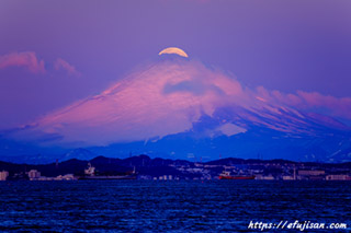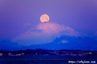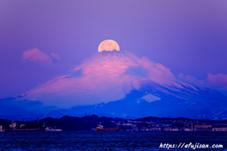 | 2月16日> 6時28分 千葉県安房郡鋸南町 NIKON D810 80-400mm(400㎜域使用) F5.6 1/50 ISO200 満月が富士山にかかる頃、山肌は赤く染まり始めました。シャッターを切る手は寒さで冷たかったです。 |